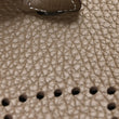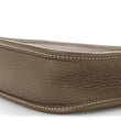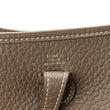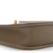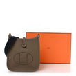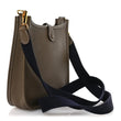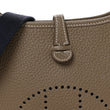 This is an authentic HERMES Taurillon Clemence Amazone Evelyne TPM in Etoupe and Bleu Indigo. This mini messenger bag is crafted of taurillon clemence calfskin leather in taupe. The shoulder bag features a dark blue canvas crossbody strap, polished gold plated hardware, and a perforated Hermes H oval logo on the front. The top is open to a taupe suede interior.