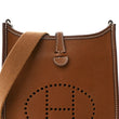 This is an authentic HERMES Taurillon Clemence Amazone Evelyne TPM in Fauve and Gold. This petite messenger bag is crafted of rich calfskin leather in golden brown and features a perforated Hermes H oval logo on one side. The bag has a golden brown canvas shoulder strap with polished palladium hardware. The top of the bag opens with a crossover strap to a golden brown suede interior.