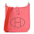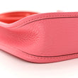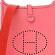 This is an authentic HERMES Taurillon Clemence Amazone Evelyne TPM in Rose Azalee and Rouge Pivoine. This classic shoulder bag is crafted of pebbled clemence calfskin leather in pink with a front perforated Hermes H oval. The bag features a red canvas shoulder strap finished with palladium hardware. The top opening secures with a small cross over strap, which opens to an interior of pink suede.