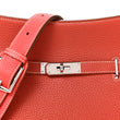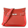 This is an authentic HERMES Taurillon Clemence Bi-Color Jypsiere 28 in Sanguine and Bougainvillea. This stylish messenger bag is beautifully crafted of red leather. The bag features an adjustable leather body strap, a full frontal flap and polished palladium silver hardware. The frontal clasp opens to a leather interior with zipper and patch pockets.