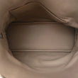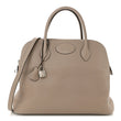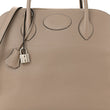 This is an HERMES Taurillon Clemence Bolide 35 in Gris Tourterelle. This stylish tote is crafted of lovely soft clemence calfskin leather in dusty grey. The handbag features rolled leather top handles, an optional leather shoulder strap with silver clasps, and a hanging clochette with keys for the padlock. The top zipper opens to a matching leather interior with a patch pocket.