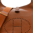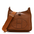 This is an authentic HERMES Taurillon Clemence Evelyne III GM in Gold. This stylish messenger bag is crafted of fine Taurillon Clemence calfskin leather in golden brown and features an adjustable matching canvas shoulder strap, a rear pocket, polished gold hardware and a perforated Hermes H oval on the front of the bag. The top of the bag opens with a cross over strap to a matching suede interior.