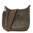 This is an authentic HERMES Taurillon Clemence Evelyne III PM in Etoupe. This cross-body messenger bag is crafted of Clemence pebbled calfskin leather in taupe brown. This popular shoulder bag features an adjustable canvas shoulder strap, a rear pocket, polished gold hardware, and a perforated oval Hermes H on the front. The top of the bag opens with a cross-over strap to a beige suede interior.
