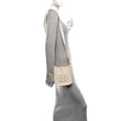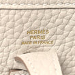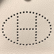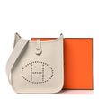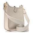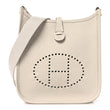 This is an authentic HERMES Taurillon Clemence Evelyne TPM in Craie. This messenger bag in the smallest size is crafted of taurillon calfskin leather in white. The bag features a white canvas body strap, polished gold tone hardware, and a perforated Hermes H oval logo. The top of the bag opens with a crossover strap to a matching suede interior.