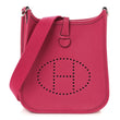 This is an authentic HERMES Taurillon Clemence Evelyne TPM in Rose Extreme. This stylish small messenger bag is crafted of textured Taurillon Clemence calfskin leather in vibrant pink. It features a perforated Hermes H oval, a canvas crossbody strap, and palladium silver hardware. The top of the bag opens with a crossover strap to a suede interior.