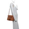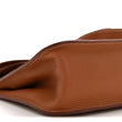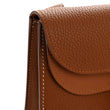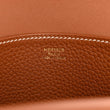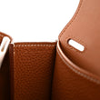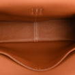 This is an authentic HERMES Taurillon Clemence Halzan 31 in Gold. This stylish and versatile handbag is crafted of grained Clemence leather in brown. The bag features rear slip pockets, covered front pockets, brown leather top handles, an adjustable brown leather crossbody strap with gold hardware, and a buckle embellishment on the front. The top opens to a brown leather interior with a large flat pocket.