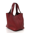 This is an authentic HERMES Taurillon Clemence Picotin Lock 22 MM in Rouge H. This stunning tote is crafted of luxuriously soft clemence calfskin leather in dark red. The bag has a relaxed bucket style structure featuring flat leather top handles and a thin cross over strap attached at one end at the other end. The top is open to a suede interior.