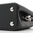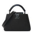 This authentic LOUIS VUITTON Taurillon Karung Capucines BB in Black and Cosmic. This beautiful bag is crafted of textured leather in black. This handbag features a leather top handle, optional shoulder strap, a flap closure, and ruthenium hardware. The top opens to a black leather interior with a zipper pocket.