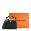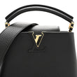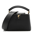 This is an authentic LOUIS VUITTON Taurillon Capucines Mini in Black. This beautiful shoulder bag is composed of luxurious textured calfskin leather in black. The handbag features a single rolled leather reinforced top handle with stylized links, an optional shoulder strap, and a crossover flap that inserts behind the prominent black and gold LV. This opens to a partitioned black leather interior with a flat pocket.