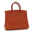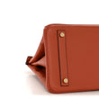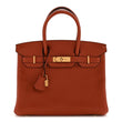 This is an authentic HERMES Taurillon Novillo Birkin 30 in Cuivre. This iconic handbag is finely crafted of grained brown calfskin leather, in the sought after mid-size. The bag features rolled leather top handles, and a short front flap, secured with a strap and polished gold turn-lock closure. This opens to a matching leather interior with a zipper and patch pocket.