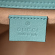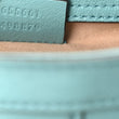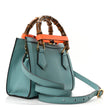This is an authentic GUCCI Textured Dollar Calfskin Web Mini Diana Tote Bag in Dusty Azure and Deep Orange. This shoulder bag is crafted of lovely calfskin leather in blue. The bag features sturdy bamboo top handles, a blue leather shoulder strap, orange leather belt handle shapers, and a gold GG logo. The top opens to a beige suede interior with a leather pocket.