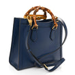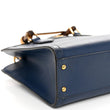 This is an authentic GUCCI Textured Dollar Calfskin Web Small Diana Tote Bag in Royal Crop. This chic shoulder bag is crafted of blue calfskin leather. The bag features a looping bamboo top handles with a yellow band, an optional shoulder strap, and gold hardware. The top opens to a beige fabric interior with a patch pocket.