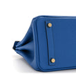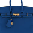 This is an authentic HERMES Togo Birkin 25 in Bleu Zellige. This classic handbag is beautifully crafted of togo calfskin in electric blue leather. The bag features rolled leather top handles, a front flap, strap closure and polished gold hardware including a turn lock and keys in the clochette. This opens to a matte goatskin leather interior with zipper and patch pockets.