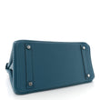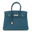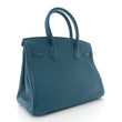 This is an authentic HERMES Togo Birkin 30 in Bleu De Galice. This ultra-chic handbag classic is crafted of luxurious calfskin leather in a shade of blue. The bag features thin but sturdy rolled leather top handles, a cross over flap with a strap closure, clasps with a palladium plated turn lock, a matching padlock and a hanging clochette with keys. This handbag opens to a spacious interior with a zipper and patch pocket.