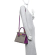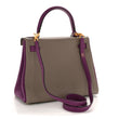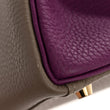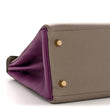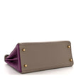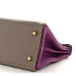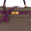 This is an authentic HERMES Togo Horseshoe Kelly Retourne 28 in Gris Asphalte and Anemone. This rare and iconic Horseshoe Kelly bag is finely crafted of textured leather in grey with purple trim. This handbag has the classic Kelly features including the iconic structured shape complemented by a small top flap and straps with a brushed gold-plated turn lock. Other hardware includes anchors at the long leather shoulder strap. The flap opens to a grey leather interior with zipper and patch pockets.