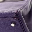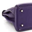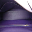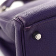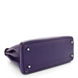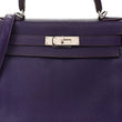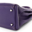 This is an authentic HERMES Togo Kelly Retourne 28 in Iris. This stylish Kelly handbag classic is crafted of beautifully textured calfskin leather in purple. The bag features a leather clasp top handle and a crossover flap with strap closure and a signature Kelly palladium silver plated turn lock with a padlock and a hanging clochette with keys. These open to a chevre goatskin leather interior.