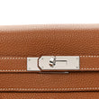 This is the authentic HERMES Togo Kelly Retourne 35 in Gold. This chic tote is crafted of luxurious togo leather in golden brown. The bag features a reinforced leather top handle with silver links, an optional shoulder strap, and a front flap secured with a strap and silver Kelly turn-lock closure. This opens to a matching leather interior with zipper and patch pockets.