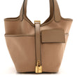 This is an authentic HERMES Toile Goeland Swift Cargo Picotin Lock 18 in Chai. This chic and lovely tote is crafted of sturdy canvas in light brown. The bag features looping leather top handles, exterior pockets, and gold hardware, including a lock and keys. The bag has an open top and a matching canvas interior with a leather base.