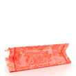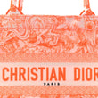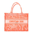 This is an authentic CHRISTIAN DIOR Transparent Canvas Embroidered Medium Dioriviera Toile De Jouy Book Tote in Orange. This colorful tote is finely crafted of embroidered canvas with a bold jungle graphic in bright orange. The bag features matching canvas rolled handles, with the CHRISTIAN DIOR logo embroidered across the front.