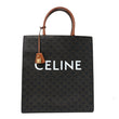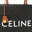 This is an authentic CELINE Triomphe Canvas Calfskin Large Vertical Cabas in Tan. This sleek tote is beautifully crafted of coated canvas with brown leather trim. The bag features brown leather top handles and a white Celine logo at the center. The top is open to a fabric interior with zipper and patch pockets.