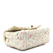 This is an authentic CHANEL Tweed Quilted Mini Rectangular Flap in Ecru, Green, Purple, Red and Yellow. This stunning small crossbody shoulder bag is crafted of white and multicolor tweed. The bag features a gold chain yellow leather threaded shoulder strap threaded with a gold Chanel CC turn lock. This opens to a compact yellow leather interior with zipper and patch pockets.