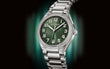 New Patek Philippe Twenty~4 Automatic luxury watch, 36mm, Stainless Steel with 160 diamonds ~0,77ct, Ref. 7300/1200A-011. Reliable and modern, feminine and elegant meticulously crafted is truly a sight to behold and a joy to wear. Despite its sophistication, this watch is presented as a casual chic that can be worn every day - a kind of all-rounder. The first model in the collection to feature a round case that is 10.05mm thin yet comfortable and has a modern look on the wrist. The elegant Olive green dial with sunburst finish along is eye-catching. It features sporty pilot-style 18k White Gold Arabic numerals with luminescent coating. The time indicated by large polished luminous nautilus-like (rounded batons) hour and minute 18k White Gold hands, ensuring perfect legibility even in the dark. These are complemented by a slim and elegant 18k White Gold second hand (Sweep seconds hand). As a classic time and date watch, this model has a date window at 6 o'clock. Thin white minute markers with squares every 5 minutes run along the outer edge of the dial. A polished Stainless Steel crown with a ribbed edge for a comfortable grip and the Patek Philippe logo is the finishing touch to the perfect picture. The dial is covered with a scratch-resistant sapphire crystal. A Sapphire Crystal case back, also made allows you to see the magical workings of the movement. The elegant highlight of model is the fixed sparkling Stainless Steel bezel set with 160 diamonds (~0,77ct) flawless. In addition, it is much more complex than just two rows of diamonds surrounding the dial. The bezel follows the curvature of the case and is raised at 12 and 6 o'clock, creating continuity with the bracelet. The model is equipped with a Patek Philippe Caliber 324 S C, with a self-winding mechanical movement containing 29 Jewels, with a power reserve of min. 35 hours - max. 45 hours. This beautiful watch is presented on a seamlessly integrated into the case of the bracelet, and the steps of the links follow the steps of the lugs, giving the watch a more barrel-shaped silhouette. The same applies to the module between the lugs, which follows the shape of the center link. The bracelet are fastens with Patek Philippe's patented polished Stainless Steel folding clasp and engraved with the Calatrava cross. Opening the clasp reveals the engraved Patek Philippe logo with the word GENEVE. Water resistant up to 30m/99ft (3 ATM).
