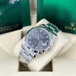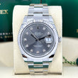 Rolex Datejust 41 watch with polished Stainless Steel and 18k White Gold case, Reference 126334-0005. This model has Grey "dark rhodium" dial with a fine sunray and Hour markers are 10 Diamonds in 18k White Gold settings. The dial is adorned polished hands - hour and minute hands with partial luminous fill. Fine printed minute track on teh dial perimeter. Moreover, every five minutes are marked with Roman numerals. Date window with a "Cyclops" magnifying lens displayed at the 3 o'clock position. Polished Stainless Steel "Twinlock" crown, featuring two sealed zones when the crown is screwed down: the first inside the tube of the crown, the second inside the winding crown itself. The dial closed by a Scratch-resistant Sapphire Crystal and solid case back made. The watch is equipped Fluted fixed polished 18k White Gold bezel. The watch is mechanical self-winding Manufacture Rolex 3235 contains 31 Jewels and has an approximate power reserve of 70 hours of power reserve. This model presented on Oyster Stainless Steel bracelet of brushed outer links and polished center links with a Folding Oysterlock safety clasp with Easylink 5 mm comfort extension link. The water resistance is up to 100m/330ft (10 ATM).