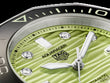 Introducing the unworn TAG Heuer Aquaracer Professional 300 Date Automatic 36mm Ladies Watch, Ref# WBP231L.BA0618 — a radiant fusion of strength, sophistication, and modern femininity. The brushed and polished stainless steel case (thickness 11.4mm) frames a stunning pastel green lacquered dial adorned with an elegant wave motif, symbolizing both fluidity and depth. Eight sparkling diamonds (0.077ct) serve as hour markers, while polished luminous indexes accent the 3, 9, and 12 o’clock positions for superior legibility. The silver-tone luminous hands and central seconds hand glide across the dial, complemented by black minute markers and a date window at 6 o’clock, enhanced by a cyclops magnifier. A unidirectional rotating bezel, crafted from polished stainless steel and black ceramic, features a distinctive green segment on the first 15 minutes, blending utility with style. Powered by TAG Heuer’s automatic movement and protected by scratch-resistant sapphire crystal, this timepiece is engineered for excellence down to 300m/1000ft of water resistance. The three-row stainless steel bracelet, featuring fine adjustment and a folding clasp with push-button micro-adjustment, ensures comfort, durability, and perfect everyday versatility. A true reflection of adventure refined through elegance.