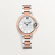 Introducing the Cartier Ballon Bleu de Cartier W3BB0021 is a refined 33mm timepiece that seamlessly blends Cartier's timeless elegance with modern functionality. Constructed from Stainless Steel and 18k Rose Gold, this watch features a Silver guilloché dial with large Roman numeral 12 and adorned 11 brilliant-cut diamonds totaling 0.05 carat, adding a touch of sparkle to its sophisticated design. The minute scale, located in the center of the dial, where every 5 minutes are marked with a square mark, increases functionality and serves as a harmonious addition. The fluted 18k Rose Gold crown is set with a synthetic cabochon-shaped spinel, a signature element of the Ballon Bleu collection. Powered by Cartier's in-house automatic movement, the watch ensures reliable timekeeping. The blued-steel sword-shaped hands glide over the dial, protected by a scratch-resistant sapphire crystal. With a case thickness of 10.16 mm and water resistance up to 30 meters (3 bar), it balances elegance with practicality. The interchangeable two-tone bracelet, combining 18k Rose Gold and Steel, offers versatility to suit various occasions. Whether paired with formal attire or casual ensembles, the Cartier Ballon Bleu de Cartier W3BB0021 exudes sophistication and charm.