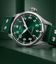 Introducing the unworn IWC Big Pilot’s Watch 43mm, Ref# IW329306 — a contemporary evolution of an icon, tailored for bold character and modern wearability. Housed in a brushed and polished stainless steel case with a streamlined 13.6mm thickness, this model retains the commanding presence of the classic Big Pilot while offering a more ergonomic 43mm case diameter. Its signature conical crown, balanced proportions, and clean silhouette reflect IWC’s aviation roots with refined sophistication. The watch’s racing green dial exudes refined minimalism, stripped of complications to emphasize pure clarity and legibility. Its clean, instrument-style aesthetic—true to the Big Pilot legacy—features a three-hand layout with rhodium-plated hands and bold Arabic numerals, all coated with luminescence for flawless visibility even in dim conditions. Around the dial’s perimeter, a precisely printed minute/second scale adds technical sharpness, while large luminous markers at five-minute intervals ensure instant readability at a glance. This fusion of form and function captures the spirit of aviation-inspired design, delivering a timepiece that is as strikingly functional as it is stylistically timeless. At its heart, the IWC-manufactured Calibre 82100 beats with precision and durability. Viewable through the sapphire case back, this robust movement features a Pellaton winding system reinforced with ceramic components and 22 jewels, offering an impressive 60-hour power reserve and built for near wear-free performance. The watch is equipped with a sporty strap made of green Calfskin Leather, decorated with four rivets, fastened with a stainless steel Deployant Buckle, which provides increased comfort and individuality. Thanks to the innovative EasX-CHANGE® system, swapping straps is quick and effortless—no tools needed. Combined with 10 bar/330ft (100 meters) water resistance, the Big Pilot 43 is not only a timeless aviation watch but also a versatile companion for modern adventures.