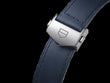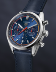 Introducing the unworn TAG Heuer Carrera Calibre Heuer 02 42mm Men’s Watch, Ref# CBN201D.FC6543, a chronograph that fuses contemporary racing spirit with timeless design. It’s brushed and polished stainless steel case houses a bold Blue Sunray Brushed dial, illuminated by a gradient orange ring around the perimeter, echoing the fiery pace of the track. A blue flange with minute, second, and fraction markers ensures precision at every glance. Applied index markers with luminous tips and polished silver-tone hands filled with luminous material guarantee legibility in any light. At 6 o’clock, the layout integrates both the small seconds sub-dial and a date window, keeping the design symmetrical and refined. The chronograph functions, driven by a column-wheel mechanism, include a large central red seconds hand, a 30-minute counter at 3 o’clock, and a 12-hour counter at 9 o’clock, ensuring accuracy for both daily timing and high-performance pursuits. Protected by a scratch-resistant sapphire crystal and framed by a fixed polished stainless steel bezel, the watch is powered by the in-house Calibre HEUER 02, beating at 28,800 vph with a robust 80-hour power reserve. A transparent case back reveals the movement’s intricate mechanics, while the blue calfskin leather strap paired with a polished steel folding clasp adds elegance and comfort. Water-resistant to 100 meters, this Carrera is a refined chronograph built for precision, endurance, and unmistakable style.