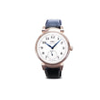 Introducing the unworn IWC Da Vinci Automatic “150 Years” Unisex Watch, Ref# IW358103 — a refined timepiece that blends heritage craftsmanship with modern sophistication. Housed in a polished 18kt Rose Gold case with a round 40.4mm profile and a slim 12.1mm thickness, this commemorative model exemplifies IWC's timeless design philosophy. Its white lacquered dial, inspired by traditional enamel work, is adorned with polished blued alpha-style hands and classic black Arabic numerals, striking a perfect balance between vintage charm and contemporary clarity. A small second’s sub-dial at 6 o’clock adds functional elegance, while the surrounding black minute track, marked by numerals at five-minute intervals, offers enhanced readability without clutter. The pull and push crown crafted from 18kt Rose Gold adds a luxurious and tactile element to the timepiece. Gleaming with a warm, refined hue, this crown offers smooth functionality while underscoring the watch's elegant character. Seamlessly integrated into the case design, it provides effortless control for time-setting, marrying practicality with the unmistakable richness of precious metal—a subtle yet powerful detail that elevates the overall sophistication of the watch. At its heart ticks the IWC-manufactured Calibre 82200 automatic movement — a technical marvel boasting 33 jewels, a 28,800 vph beat rate, and an impressive 60-hour power reserve. Visible through the transparent sapphire case back, the movement’s refined mechanics and Côtes de Genève finishing speak to the watch’s elite pedigree. Framing the dial with understated elegance, the fixed polished 18kt Rose Gold bezel adds a refined brilliance to the watch’s overall design. Its sleek, mirror-like finish not only enhances the visual symmetry of the timepiece but also reflects the craftsmanship and attention to detail inherent in luxury watchmaking. This bezel, while simple in form, serves as a timeless accent—subtle yet striking—perfectly complementing both formal attire and everyday sophistication. Fitted with a rich black alligator leather strap by Santoni, secured with a classic 18kt Rose Gold pin buckle, and water resistant to 30 meters, the Da Vinci Automatic is a versatile piece of horological artistry — a distinguished companion for both him and her, built to last for generations.