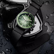 Introducing the unworn Blancpain Fifty Fathoms Bathyscaphe Chronographe Flyback, Ref# 5200-0153-NABA — a masterful fusion of underwater resilience and high-performance chronograph engineering. Housed in a bold 43.6mm brushed black ceramic case with a commanding 15.25mm thickness, this timepiece pays homage to Blancpain’s diving heritage while embracing modern material innovation. The graduated green dial with a fine sunray finish is both sleek and highly legible, featuring applied darkened steel hour markers and bold square hands, all filled with luminous material for clarity in low light. The date window is subtly positioned between 4 and 5 o'clock, while the small seconds display is positioned at 6 o'clock, enhancing the functionality of this model.This chronograph excels in function with a flyback feature, allowing instant reset and restart with a single push — ideal for precision timing. The dial integrates a central red-tipped seconds hand, a 30-minute counter at 3 o’clock, and a 12-hour counter at 9 for comprehensive time tracking. Encircling the dial is a unidirectional rotating bezel in brushed black ceramic, with brushed green ceramic insert and graduated with a Liquidmetal™ 60 minutes scale, ensuring both durability refined finish. A luminous raised dot at 12 o'clock ensures dive-readiness. At its core beats the in-house Blancpain Caliber F385, a 37-jewel automatic movement with a 50-hour power reserve. Composed of 322 parts and equipped with a silicon balance spring, it resists magnetism, corrosion, and aging with remarkable efficiency. The transparent case back reveals its sophisticated inner workings. Built for endurance and refined with precision, this timepiece features a scratch-resistant sapphire crystal that ensures lasting clarity and protection against the elements. The black ceramic screw-in crown not only enhances water resistance but also adds a sleek, modern touch to the watch’s robust design—offering both functionality and aesthetic strength in one seamless detail. Fitted with a black NATO strap and a pin buckle clasp, this timepiece arrives in a rugged Peli water-resistant case, built for adventure. With 300 meters of water resistance, the Bathyscaphe Flyback is as ready for the depths as it is for everyday excellence.