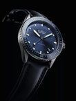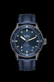 Introducing an unworn timepiece that seamlessly blends heritage with innovation — the Blancpain Fifty Fathoms BathyscapheRef# 5000-0240-O52A. This modern reissue pays homage to a legendary diver’s watch first introduced in 1953, reinterpreting the celebrated late-1950s Bathyscaphe model with a contemporary edge. Encased in brushed Grey ceramic, the bold 43.6mm and thickness 13.83mm case is both lightweight and incredibly durable, embodying Blancpain’s commitment to performance-driven design. With its fusion of vintage aesthetics and modern engineering, this Bathyscaphe is more than a diving tool — it's a timeless statement of technical mastery and refined style. The unidirectional rotating bezel, fashioned from brushed ceramic with a polished blue ceramic insert, features Liquidmetal® graduated markings—a fusion of durability and aesthetic finesse that resists wear while maintaining a flawlessly smooth surface. A luminous raised dot at the 12 o’clock position ensures optimal legibility in low light. The dial stuns with a metallic blue sunray finish, adorned with polished steel hour markers and bold hands, all filled with luminescent material for deep-sea visibility. A polished seconds hand with a luminous dot and red-tipped pointer adds both function and visual flair. A discreet date window rests between 4 and 5 o’clock. Powering the watch is the Blancpain Caliber 1315, a high-performance automatic movement composed of 227 parts, operating at 28,800 vph. With 35 jewels and a remarkable 120-hour power reserve, the work of which can be seen through the transparent back of the case, this movement features a nonmagnetic silicon balance spring, delivering outstanding resilience against magnetism, corrosion, and aging. This deep-diving masterpiece is water-resistant to 300 meters (1000 feet) and comes equipped with a blue Sail-canvas strap and a tang buckle, offering comfort and durability above and below the surface. The watch is presented in a genuine Peli water-resistant case, underscoring its adventurous pedigree. A true fusion of heritage, innovation, and craftsmanship, the Bathyscaphe is the ultimate companion for modern explorers.