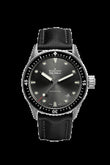 Introducing an unworn timepiece that seamlessly blends heritage with innovation — the Blancpain Fifty Fathoms BathyscapheRef# 5000-1110-B52A. This modern reissue pays homage to a legendary diver’s watch first introduced in 1953, reinterpreting the celebrated late-1950s Bathyscaphe model with a contemporary edge. Encased in brushed Stainless Steel, the bold 43mm and thickness 13.4mm case is both lightweight and incredibly durable, embodying Blancpain commitment to performance-driven design. With its fusion of vintage aesthetics and modern engineering, this Bathyscaphe is more than a diving tool — it's a timeless statement of technical mastery and refined style. The unidirectional rotating bezel, fashioned from brushed Stainless Steel with a Black ceramic fill - highly scratch resistant, features Liquidmetal® graduated markings—a fusion of durability and aesthetic finesse that resists wear while maintaining a flawlessly smooth surface. A luminous raised dot at the 12 o’clock position ensures optimal legibility in low light. The Metallic grey with a very fine sunray finish dial stuns adorned with polished steel hour markers and bold hands, all filled with luminescent material for deep-sea visibility. A polished seconds hand with a luminous dot and red-tipped pointer adds both function and visual flair. A discreet date window rests between 4 and 5 o’clock. Powering the watch is the Blancpain Caliber 1315, a high-performance automatic movement composed of 227 parts, operating at 28,800 vph. With 35 jewels and a remarkable 120-hour power reserve, the work of which can be seen through the transparent back of the case, this movement features a nonmagnetic silicon balance spring, delivering outstanding resilience against magnetism, corrosion, and aging. This deep-diving masterpiece is water-resistant to 300 meters (1000 feet) and comes equipped with a black Sail-canvas strap and a tang buckle, offering comfort and durability above and below the surface. The watch is presented in a genuine Peli water-resistant case, underscoring its adventurous pedigree. A true fusion of heritage, innovation, and craftsmanship, the Bathyscaphe is the ultimate companion for modern explorers.