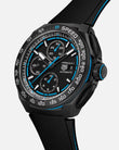 Introducing the unworn TAG Heuer Formula 1 Chronograph Automatic 44mm, Ref# CBZ2084.FT8097 — a dynamic expression of TAG Heuer’s racing spirit, engineered for those who live life at full throttle. Built from Grade 2 DLC-coated titanium, the sandblasted case exudes a rugged, technical appeal while ensuring exceptional lightness and strength. A blue highlight ring between the case and bezel adds a burst of color, underscoring the watch’s high-performance DNA. The fixed black DLC-coated titanium bezel with an aluminum tachymeter insert reinforces its bold, purposeful aesthetic, perfectly complementing the black dial distinguished by a striking blue lacquered track around the edge. Applied polished luminous Super-LumiNova®-applied indexes and luminous Super-LumiNova®-applied hands ensure readability in all lighting conditions, while the black flange with minute and second markings brings precision to every glance. True to its chronograph pedigree, the watch features a large blue central seconds counter hand, a 30-minute counter at 12 o’clock, and a 12-hour counter at 6 o’clock, while a small seconds sub-dial at 9 o’clock and date window at 3 o’clock complete the dial’s balanced design. Beneath the surface, the reliable TAG Heuer Calibre 16 automatic movement beats at 28,800 vph (4Hz) with a 42-hour power reserve and 25 jewels, delivering impeccable timing performance. Protected by a scratch-resistant sapphire crystal and a solid case back, this chronograph is ready for every challenge. The DLC-coated titanium pushers and screw-down crown add both durability and water resistance, while the black rubber strap with a fine-brushed stainless steel pin buckle ensures a secure, comfortable fit during high-speed pursuits. Water-resistant to 200 meters, the TAG Heuer Formula 1 Chronograph Automatic is a bold fusion of precision engineering and sporting attitude — a timepiece built for champions of speed and style.