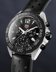 Introducing an unworn TAG Heuer Formula 1 Chronograph, Ref# CAZ1010.FT8024 watch with a brushed stainless steel case size 43mm and 11,5mm thickness, providing a significant presence on the wrist. Crafted for those who demand precision and durability, this chronograph combines sleek design with cutting-edge functionality. The round case houses a striking black dial, accentuated by a black titanium carbide-coated steel bezel with a raised tachymeter scale for enhanced readability. Designed for functionality, the chronograph stopwatch features a red-tipped central seconds counter, a 1/10th-second counter at 6 o’clock, a 30-minute counter at 9 o’clock, and a small seconds sub-dial at 3 o’clock. A discreet date window at 4 o’clock adds convenience without compromising aesthetics. For visibility in any condition, luminous hands and hour markers ensure clarity, while a scratch-resistant sapphire crystal protects the dial from everyday wear. An end-of-battery-life indicator alerts you with a second’s hand that jumps every four seconds, ensuring you’re never caught off guard. Built for adventure, this timepiece features a screw-in crown and offers an impressive water resistance of 200m (660ft), making it suitable for professional marine activity and water sports. The solid case back enhances durability, while the Black Rubber strap with a Stainless Steel Tang Buckle ensures a secure and comfortable fit. At its core, a precise quartz movement powers this exceptional watch, making it a reliable companion for those who value both style and performance.