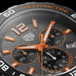 Introducing the unworn TAG Heuer Formula 1 Chronograph Men’s Watch, Ref# CAZ101AH.BA0842 — a bold timepiece that captures the thrill of motorsport with a fusion of performance and striking design. Its 43mm brushed and polished stainless steel case frames a grey textured dial, accented with lime-Orange index markers and hands, both luminous for uncompromising legibility. Contrasting black sub-dials add depth, while a fine blue second’s track on the flange introduces a subtle racing detail. Chronograph functions are sharply displayed: a large central sOrange econds counter, a 30-minute counter at 9 o’clock, and a 1/10th of a second counter at 6 o’clock, with a small seconds sub-dial at 3 o’clock. The date window at 4 o’clock ensures practical utility without disrupting the symmetry. Surrounding it all, the fixed black ceramic tachymeter bezel and black ceramic pushers with a PVD-coated screw-in crown emphasize its high-performance spirit. Driven by the reliable Ronda 5040.D quartz movement, it offers precision timing supported by an end-of-life battery indicator, ensuring accuracy until the very last beat. Finished with a brushed stainless steel bracelet and Foldover clasp with push-button release, this Formula 1 is engineered for both comfort and security. Water-resistant to 200 meters, it’s as ready for the circuit as it is for everyday wear.