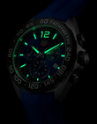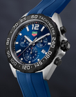 Introducing the unworn TAG Heuer Formula 1 Chronograph Quartz, Ref# CAZ101AV.FT8077 — a bold, precision-driven timepiece built to capture the thrill of racing. Its 43mm brushed stainless steel case, paired with a 12.4mm profile, delivers a commanding yet versatile presence on the wrist. The blue sunray dial takes center stage, accented with luminous silver-tone hands, sleek stick markers, and a bold Arabic numeral at 12 o’clock for instant readability. Around the edge, a black flange with crisp white five-minute numerals and a red starting triangle evokes the timing instruments of the pit lane. The dial’s racing-inspired chronograph layout features a small second’s sub-dial at 3 o’clock, a 30-minute counter at 9, and a 1/10th of a second counter at 6o’clock. A red-tipped central second’s hand sweeps across the dial, while a date window at 4 adds functional balance. Powered by the reliable Ronda 5040.D quartz movement, this chronograph is built for performance — complete with an end-of-life battery indicator that signals precision timing until the very last tick. Robust features include a scratch-resistant sapphire crystal, the watch features a black PVD-coated Chronograph buttons and a screw-down black PVD-coated Stainless Steel crown, a fixed black PVD bezelwith Tachymeter Markings, and 200m water resistance, ensuring it’s ready for both speed and endurance. Fitted with an ultra-resistant blue rubber strap with brushed stainless steel Tang Buckle clasp, this timepiece delivers both strength and comfort, making it the perfect companion for an action-packed lifestyle. Engineered to endure dynamic conditions while ensuring a secure fit, the strap adds a bold, sporty edge that matches the watch’s adventurous spirit. The TAG Heuer Formula 1 Chronograph Quartz is not just a watch — it’s a tribute to motorsport’s relentless pursuit of speed, precision, and adrenaline.