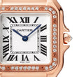 Introducing the timeless expression of elegance and sophistication, the Cartier Panthère de Cartier WJPN0009 Medium Ladies Watch is more than just a timepiece—it's a piece of haute joaillerie that adorns the wrist with quiet glamour. Born in the 1980s and reinvented for the modern era, the Panthère remains an enduring icon for women with an eye for style and a presence that commands attention. The square 27mm x 36mm case, crafted from polished 18k Rose Gold is accentuated by an 18k Rose Gold bezel set with flawless 44 brilliant-cut diamonds—adding just the right amount of radiance. The case measures a sleek 6mm in thickness, providing a refined, ultra-feminine profile on the wrist. Its silvered dial with large black Roman numerals, elegantly understated. The minute scale, located in the center of the dial, where every 5 minutes are marked with a square mark, increases functionality and serves as a harmonious addition. The signature Cartier 18k Rose Gold crown is topped with a diamond, completing the maison’s unmistakable aesthetic. Powered by a precise quartz movement and protected by a scratch-resistant sapphire crystal, this watch offers reliable functionality wrapped in unmistakable luxury. The bracelet, composed of 18k Rose Gold links, ensures a seamless blend of durability and decadence, fastening with an 18k Rose Gold hidden folding clasp for a clean finish. Water resistant to 30 meters (100 feet), this exquisite timepiece is perfect for the woman who demands refinement in every detail—whether dressed for an evening out or navigating a busy day with poise and polish.