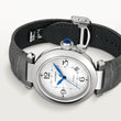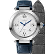Radiating elegance with bold sophistication, the unworn Cartier Pasha Men’s Watch Ref# WSPA0010 with Stainless Steel case 41mm is a refined expression of contemporary luxury. Crafted from Stainless Steel fixed smooth bezel creating an beautiful frame for the Silver flinqué patterned dial with features bold black Arabic numerals 3,6,9,12 at the cardinal points, a thin square fine printed minute/seconds track in the center with small blue squares every five minutes, and blued steel hands. Complementing this design is a neatly positioned between 4 and 5 o'clock date window at, maintaining a harmonious combination of functionality and style. A scratch-resistant sapphire crystal safeguards the dial, offering exceptional clarity and durability. The distinctive screw-down crown cap, set with a synthetic spinel cabochon and connected by a delicate silver chain, is a signature element of the Pasha’s unique character. Powering the watch is Cartier’s in-house Caliber 1847MC, an automatic movement boasting 23 jewels, a 48-hour power reserve, and a smooth 28,800-vph frequency for reliable performance, visible through a transparent case back. Paired with a luxurious blue alligator strap and matching stainless steel Deployant Buckle, this watch offers exceptional comfort and long-lasting style. An optional grey alligator strap adds versatility to the watch. The Cartier QuickSwitch system makes changing straps hassle-free and tool-free. Whether worn casually or for formal occasions, the Pasha WSPA0010 is a masterful blend of function, fashion, and fine horology.