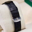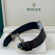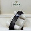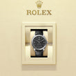Unworn watch Rolex Perpetual 1908, 39mm, 18k White Gold, Ref# 52509-0002. Striving for the highest level of quality to achieve flawless, long-lasting results is the life philosophy of Rolex. It is in this vein that the global brand has developed a classic collection of watches with a new name and a new look, modestly dressy, ideal for a business suit - Rolex Perpetual 1908. Paying homage to the year in which the "Rolex" lettering first appeared on the dials, the entire Perpetual 1908 model inspired by the watchmaker's first creation to feature a self-winding rotor. Proof of this is the stunning Intense Black dial with superbly long and narrow 18k White Gold applied indexes and Arabic numerals at 12, 3 and 9 o'clock. At 6 o'clock is a small second’s dial, sportier than you might expect, with 20, 40 and 60 on the track. An elegant sword-shaped minute hand with a classic hour hand marked with a ring at the tip, made of 18k White Gold. A well-readable minute scale is applied along the outer contour of the dial. All this charm is complemented by a ribbed, for a comfortable grip, domed screw-down crown in 18k Yellow Gold with the Rolex logo. The dial is covered with a scratch-resistant sapphire crystal. The highlight of the model is the two-tiered 18k White Gold bezel with a convex and tactile upper part and a characteristic grooved lower part. The model is powered by the in-house automatic Rolex mechanical movement caliber 7140, new 2023, contains 38 jewels and has an approximate power reserve of approximately 66 hours. The mesmerizing work of the mechanism can be seen through the transparent case back. This impressive watch is presented on a matt Black alligator leather strap with green lining and tone-on-tone stitching, custom made for this model. It is fitted with an 18k White Gold Dualclasp folding clasp. Thanks to its carefully shaped design, the Dualclasp is always centered on the wrist for maximum comfort. Water resistant up to 50m/165ft (5 ATM).