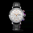 The unworn IWC Portofino Chronograph, Ref# IW391031, blends timeless elegance with refined functionality, capturing the spirit of 1960s sophistication. Housed in a polished 42mm stainless steel round case, 13.5mm thick, and the watch exudes balanced proportions and understated luxury. Its silver-plated dial features applied polished gold tone applied index and Roman numeral in position 6 and 12 o’clock hour markers, paired with slender gold tone hands, all set against a finely printed minutes, seconds, and fractions-of-a-second track where every 5 minutes are marked with Arabic numerals for precise time reading. At 3 o’clock, a neatly framed day and date display adds everyday practicality. The chronograph layout is impeccably balanced, with a 30-minute counter at 12 o’clock, a 12-hour counter at 6 o’clock, and a small seconds sub-dial at 9 o’clock. The large central chronograph seconds hand ensures clear timing at a glance. Inside, the IWC caliber 75320 — a robust automatic movement beating at 28,800 vph with 25 jewels — offers a 44-hour power reserve, safeguarded by a scratch-resistant sapphire crystal and a solid case back. Elegant, elongated push-buttons and chronograph displays nod to vintage chronographs, while the black alligator leather strap completes the look with a touch of classic Italian flair. Water-resistant to 30 meters, the Portofino Chronograph is as versatile as it is stylish — equally at home in formal settings or casual weekends.