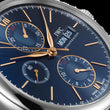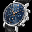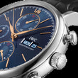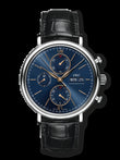 The unworn IWC Portofino Chronograph, Ref# IW391036, family masterfully blends the relaxed charm of the Mediterranean lifestyle with an enduring sense of refinement and subtle glamour. Since 1988, chronographs have been an integral part of elegant collection IWC Portofino, adding a dynamic edge to its classic aesthetic. Housed in a polished 42mm stainless steel round case, 13.5mm thick, and the watch exudes balanced proportions and understated luxury. Its Blue dial features applied polished Rose gold-tone applied index and Roman numeral in position 6 and 12 o’clock hour markers, paired with slender Rose gold-tone slender feuille hands, all set against a finely printed minutes, seconds, and fractions-of-a-second track where every 5 minutes are marked with Arabic numerals for precise time reading. At 3 o’clock, a neatly framed day and date display adds everyday practicality. The chronograph layout is impeccably balanced, with a 30-minute counter at 12 o’clock, a 12-hour counter at 6 o’clock, and a small seconds sub-dial at 9 o’clock. The large central chronograph seconds hand ensures clear timing at a glance. The Portofino Chronograph not only embodies timeless design but also delivers practical functionality, effortlessly measuring single stop times and aggregate timing of up to 12 hours. Inside, the IWC caliber 75320 — a robust automatic movement beating at 28,800 vph with 25 jewels — offers a 44-hour power reserve, safeguarded by a scratch-resistant sapphire crystal and a solid case back. Elegant, elongated push-buttons and chronograph displays nod to vintage chronographs, while the black alligator leather strap completes the look with a touch of classic Italian flair. Water-resistant to 30 meters. This harmonious fusion of sophistication and sportiness ensures the watch is equally suited for laid-back coastal afternoons or more formal occasions, making it a true embodiment of versatile elegance.