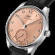 Introducing the unworn IWC Portugieser Automatic 40mm Men's Watch, Ref# IW358313—a masterful blend of understated elegance and mechanical precision. Housed in a stainless steel case with brushed edges and a polished fixed bezel, the 40.4mm round silhouette offers a timeless presence, while its 12.3mm thickness ensures a comfortable, modern fit. The salmon-coloured with a fine sunray finish dial exudes quiet sophistication, highlighted by applied polished rhodium-plated Arabic numerals and a slim minute track along the outer rim, marked with rhodium-plated indices at five-minute intervals. At 6 o’clock, a refined small hacking second’s sub-dial features a delicate concentric circular texture and polished rhodium-plated hand, lending depth and precision to the clean design. Powering this elegant timepiece is the IWC-manufactured Caliber 82200—an automatic movement beating at 28,800 vph, with 31 jewels and a 60-hour power reserve. The inner workings can be admired through the transparent sapphire crystal case back, showcasing IWC’s commitment to fine watchmaking. Protected by an anti-reflective scratch-resistant sapphire crystal, the dial remains legible in all conditions. The pull/push crown in stainless steel is thoughtfully designed for ease of adjustment while maintaining the watch’s clean profile. Paired with a classic black alligator leather strap, the timepiece features a newly developed butterfly-folding clasp that ensures a secure and exceptionally comfortable fit. Water-resistant to 30 meters (99 feet), the IWC Portugieser Automatic is a refined companion for both daily wear and formal occasions—an enduring symbol of sophistication and horological craftsmanship.