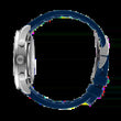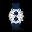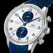 Introducing the unworn IWC Portugieser Automatic Chronograph, Ref# IW371620—a striking reinterpretation of one of Schaffhausen’s most iconic timepieces. Designed to honor the brand’s heritage of nautical precision, this 41mm chronograph embodies timeless elegance fused with technical prowess. The brushed and polished stainless steel case, with a round 13mm thickness, offers a refined yet sporty silhouette. The silver-plated dial creates a timeless base for the watch's elegant details, embodying the discreet luxury typical of classic watchmaking. The design is accentuated by blued stainless steel feuille hands and applied blued stainless steel Arabic numeral hour markers, while a subtle blued stainless steel dot minute/seconds track runs around the periphery for balanced symmetry. A hallmark of this model is the fractions-of-a-second track printed along the inner flange—also known as the réhaut—featuring a quarter-second scale for precision timekeeping. This not only emphasizes the chronograph’s functionality but also echoes the Portugieser’s legacy as a seafaring instrument of accuracy. Chronograph features include a large central seconds counter hand, a contrasting blue 30-minute counter at 12 o’clock, and a contrasting blue small seconds sub-dial at 6 o’clock, delivering both balance and clarity. At the heart of the watch is the IWC-manufactured caliber 69355, a robust automatic movement composed of 194 components, beating at 28,800 vph, with 27 jewels and a 46-hour power reserve. The transparent sapphire case back reveals this high-performance mechanism in motion. Additionally, this elegant sports watch features a versatile blue rubber strap that combines durability with contemporary style. Designed for an active lifestyle, the strap provides a secure and comfortable fit thanks to its flexible design and classic clasp, allowing you to wear the watch all day long and giving it a sleek, sporty look. With water resistance up to 30 meters (100 feet) and its subtly thin bezel, the watch wears larger than its size suggests, making a bold yet tasteful statement on any wrist. This Portugieser Automatic Chronograph is more than a timepiece—it’s a legacy of precision, style, and craftsmanship born from the world of maritime navigation.