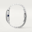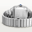 Introducing the Cartier Santos De Cartier Dual Time Men’s Watch, Ref# WSSA0076 — a masterclass in refined innovation and iconic design. This unworn timepiece brings together brushed Stainless Steel case with polished beveled corners, seamlessly blending sporty elegance with classic sophistication. The 40.2mm square case features a bold polished Stainless Steel bezel secured with eight exposed screws — a signature Santos aesthetic. A brushed and polished Stainless Steel 7-sided crown, set with a faceted Blue synthetic spinel cabochon, adds a subtle touch of Cartier charm. The satin-finish gradated grey sunrays-brushed dial is adorned withprinted Silver Roman numeral hour markers and complemented by Rhodium-finish polished steel sword-shaped luminous filled hour and minute hands and an elegant white second’s hand. In the center is a finely printed Silver minute/seconds scale with bright markers every five minutes, reminiscent of train tracks and at 3 o'clock is a date window, adding charm and practical functionality. Designed for the modern traveler, the second time zone display features an additional hour hand nestled within a dedicated counter at the 6 o'clock position, accompanied by a day/night indicator—offering intuitive, at-a-glance tracking of time across continents with both style and precision. Cartier’s in-house caliber SW330 automatic movement, beating at 28,800 vph with 25 jewels and offering a 48-hour power reserve, powers this model. The timepiece comes equipped with Cartier’s innovative QuickSwitch system, allowing effortless interchange between the brushed Stainless Steel bracelet and the included grey alligator leather strap with interchangeable folding steel buckle, without the need for tools. The SmartLink system further enables easy sizing adjustments of the bracelet by the wearer. Finished with a scratch-resistant sapphire crystal, solid case back, and rated water-resistant up to 100 meters (330 feet), the Santos WSSA0076 is a sophisticated companion built for both everyday wear and formal occasions.