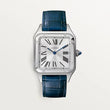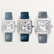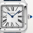 Elevating a legendary silhouette with refined brilliance, the Cartier Santos Dumont de Cartier Ref# WSSA0022, Large Watch brings together timeless design and modern innovation. Exquisitely detailed and versatile, this timepiece is perfect for those who appreciate understated luxury and everyday elegance. The 43.5mm x 31.4mm square case, crafted from Stainless Steel with polished beveled edges, delivers a bold yet balanced presence on the wrist. The standout feature is the Stainless Steel bezel, securely fastened with Cartier’s signature exposed screws. The polished beaded Stainless Steel crown, set with a faceted synthetic spinel cabochon, completes the design with an iconic flourish. The silvered satin-brushed dial with sunray effect is graced with bold black Roman numeral hour markers, a fine minute/seconds track along the perimeter, reminiscent of railway tracks and blued steel sword-shaped hands, offering striking legibility against the light-toned background. At its heart, the watch houses Cartier’s in-house quartz movement, this watch ensures effortless, maintenance-free performance for daily wear. Scratch-resistant sapphire crystal and a robust case back protect the dial and movement, ensuring long-lasting, accurate performance. A Navy Blue alligator leather strap adds warmth and texture, paired with a classic Stainless Steel Tang buckle for a secure, comfortable fit. The unworn Cartier Dumont de Cartier WSSA0022 with water resistant to 30 meters (100 feet) is the epitome of quiet luxury, effortlessly bridging the gap between daywear elegance and evening refinement.