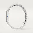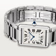 Introducing unworn large watch, the Cartier Tank Must de Cartier Ref# WSTA0052 embodies the brand's commitment to timeless elegance and minimalist design. Drawing inspiration from the original Tank watch introduced in 1917, this model maintains the iconic rectangular silhouette and clean lines that have become synonymous with Cartier's watchmaking heritage. Constructed from polished Stainless Steel, the case measures 33.7mm x 25.5mm with a thickness of 6.6 mm, offering a balanced presence on the wrist. This model is part of Cartier's Tank Must collection, which reimagines the classic Tank design with modern updates while maintaining its iconic features. The Silvered dial with Black printed Roman numeral hour markers complemented by blued-steel sword-shaped hands. In the center is a finely printed black minute/seconds scale with bright markers every five minutes, adding charm and practical functionality. A beaded Stainless Steel crown set with a blue synthetic cabochon-shaped spinel adds a touch of sophistication, a signature detail in Cartier's design language. Powered by a high-autonomy quartz movement, the watch offers reliable timekeeping with minimal maintenance. The watch is paired with an interchangeable brushed and polished Stainless Steel bracelet, secured by a Stainless Steel Deployant Clasp, ensuring both comfort and style.Finished with a scratch-resistant sapphire crystal, solid case back, and rated water-resistant up to 30 meters (100 feet), the Santos WSTA0052 is a sophisticated companion built for both everyday wear and formal occasions.