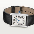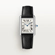 Introducing unworn large watch, the Cartier Tank Must de Cartier Ref# WSTA0109 embodies the brand's commitment to timeless elegance and minimalist design. Drawing inspiration from the original Tank watch introduced in 1917, this model maintains the iconic rectangular silhouette and clean lines that have become synonymous with Cartier's watchmaking heritage. Constructed from polished stainless steel, the case measures 33.7mm x 25.5mm with a thickness of 6.6 mm, offering a balanced presence on the wrist. This model is part of Cartier's Tank Must collection, which reimagines the classic Tank design with modern updates while maintaining its iconic features. The Silvered dial with Black printed Roman numeral hour markers complemented by blued-steel sword-shaped hands. In the center is a finely printed black minute/seconds scale with bright markers every five minutes, adding charm and practical functionality. A beaded crown set with a blue synthetic cabochon-shaped spinel adds a touch of sophistication, a signature detail in Cartier's design language. Powered by a high-autonomy quartz movement, the watch offers reliable timekeeping with minimal maintenance. The watch is paired with an interchangeable black grained calfskin strap, secured by a stainless steel ardillon buckle, ensuring both comfort and style.Finished with a scratch-resistant sapphire crystal, solid case back, and rated water-resistant up to 30 meters (99 feet), the Santos WSTA0109 is a sophisticated companion built for both everyday wear and formal occasions.